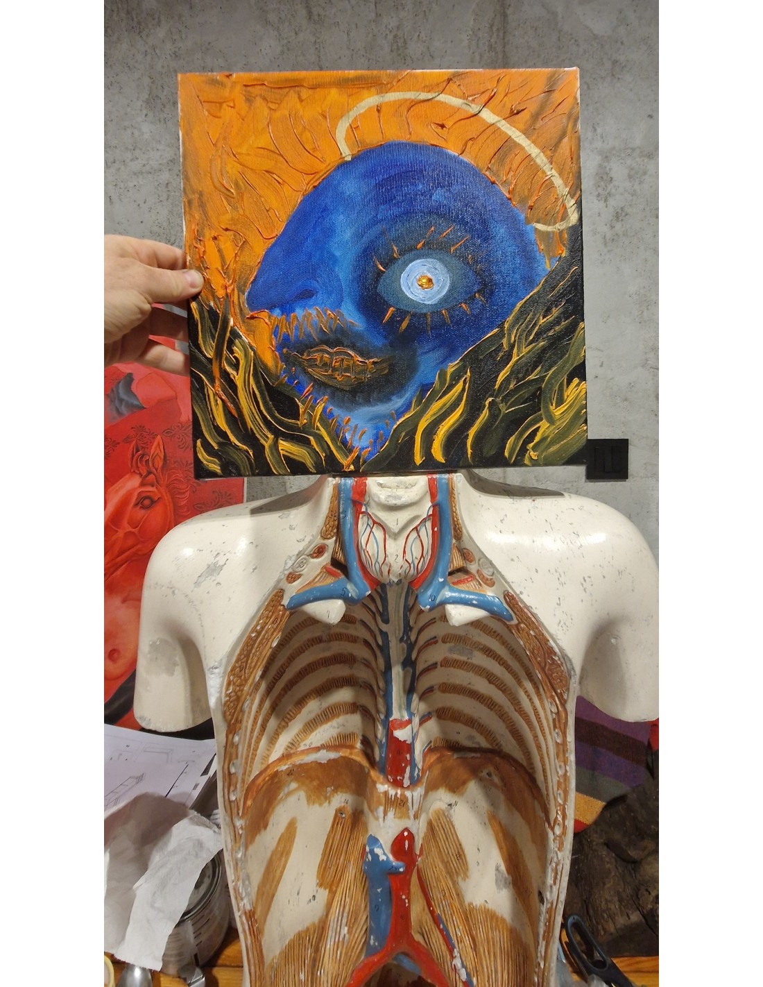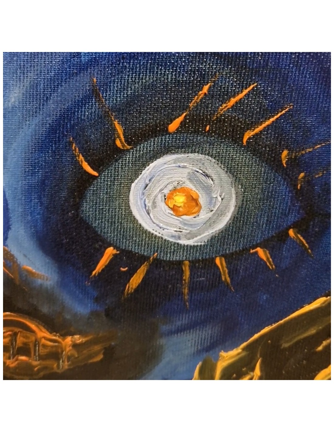 Oil painting. Format 30 × 30. Year 2025. I enclose this story in a compact form, like embers that do not need a large space to be intense and spread.