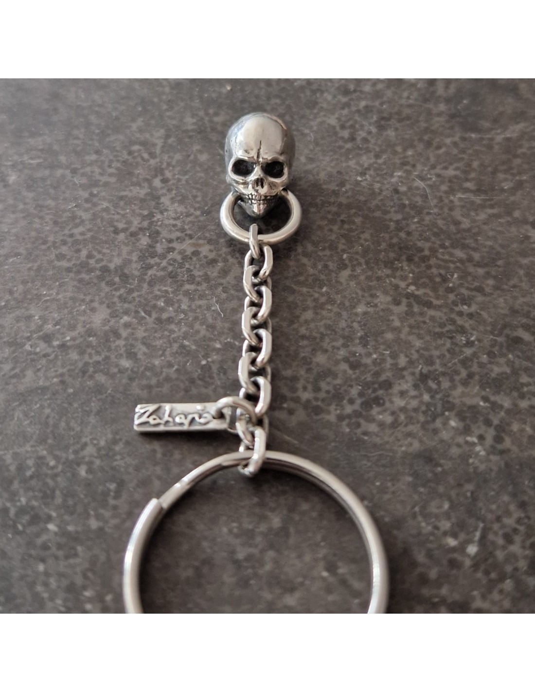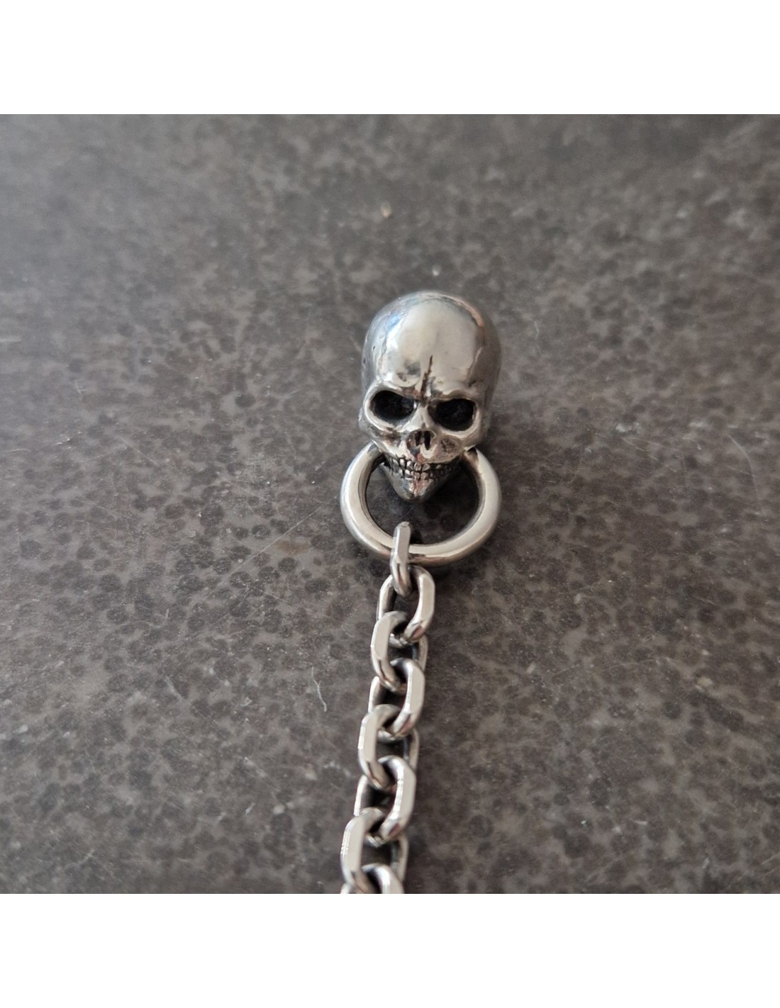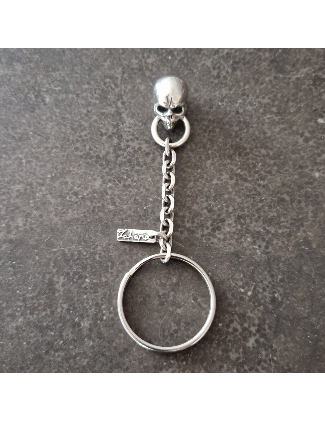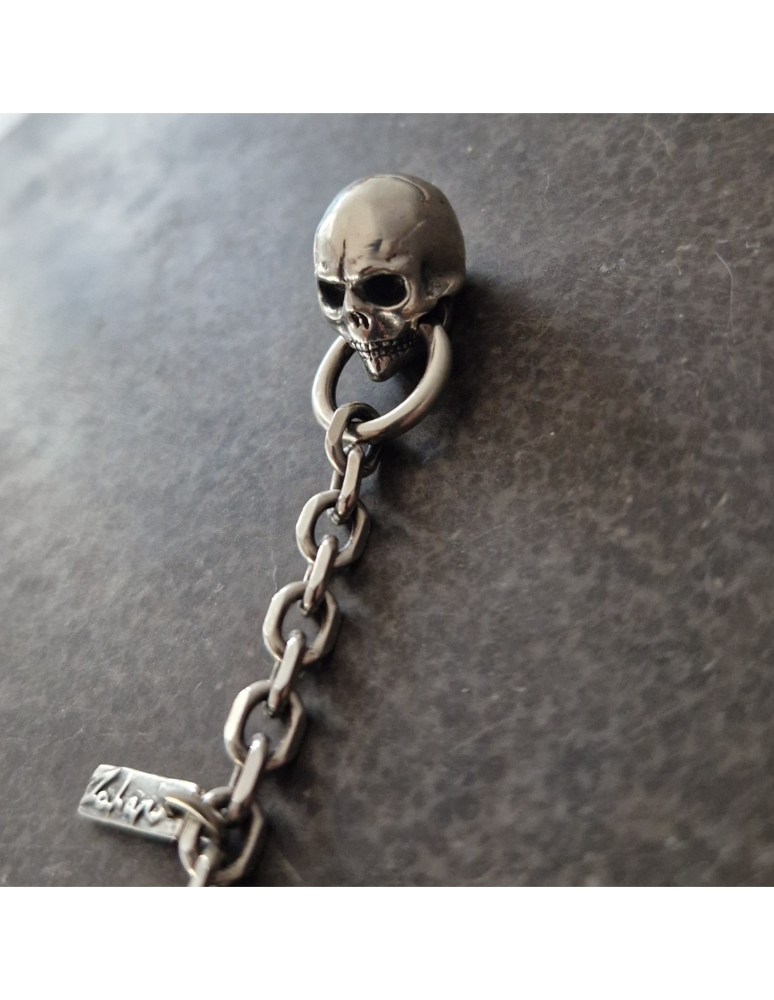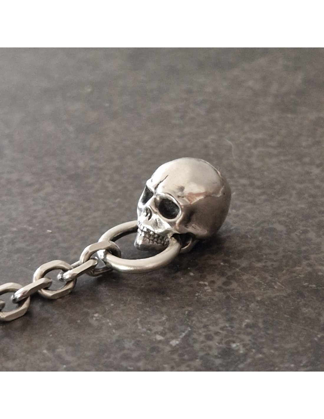 Symbol nieśmiertelnego połączenia między życiem a przedmiotem codzienności. To nie tylko brelok, lecz mała rzeźba talizman który nosi w sobie surową elegancję i odrobinę mroku. Ręcznie wykonany breloczek ze srebra, w którym każdy detal zdradza pasję i kunszt artysty. Solidne stalowe kółko do kluczy połączone jest ze srebrnym łańcuchem. Na jego końcu zawieszona została precyzyjnie wyrzeźbiona czaszka, trzymająca w szczękach kółko, do którego zaczepiony jest łańcuch.